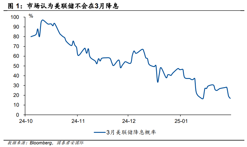 事实上,本年开年以来,“特朗普往复”的举座发达并不睬念念,好意思元开年出现了昭彰的回撤,纳指和数字货币大幅波动,这些齐意味着特朗普的战术需要进一步了了。商场订价的2025年降息1次,其实也诠释投资者心里压根齐是“特没谱”。从好意思联储议息会议的后果来看,加息的可能性基本摈斥,但降息何时再度开动以及幅度,仍然需要至少比及3月中旬。当前来看,3月降息的概率如何舞动,会是本年第一季度最弥留的商场标尺之一。