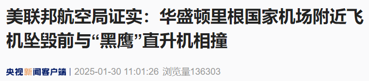 好意思联邦航空局证实:华盛顿里根国度机场近邻飞机坠毁前与“黑鹰”直升机相撞
