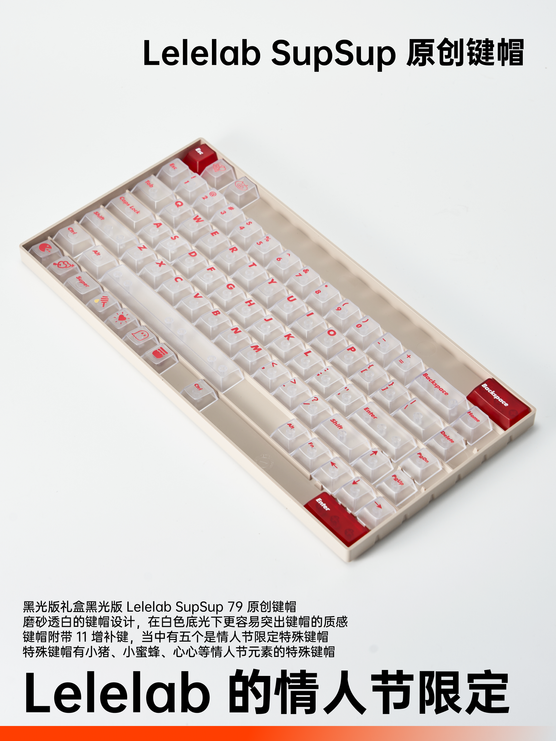 礼盒内提供的另一套键帽,Lelelab SupSup 白红透光 79 键帽给与了名义磨砂管理,合营键盘的白光花式更容易凸起质感。增补键帽里面还加入了小猪、小蜜蜂、心心连续的图案,更贴合情东谈主节主题。