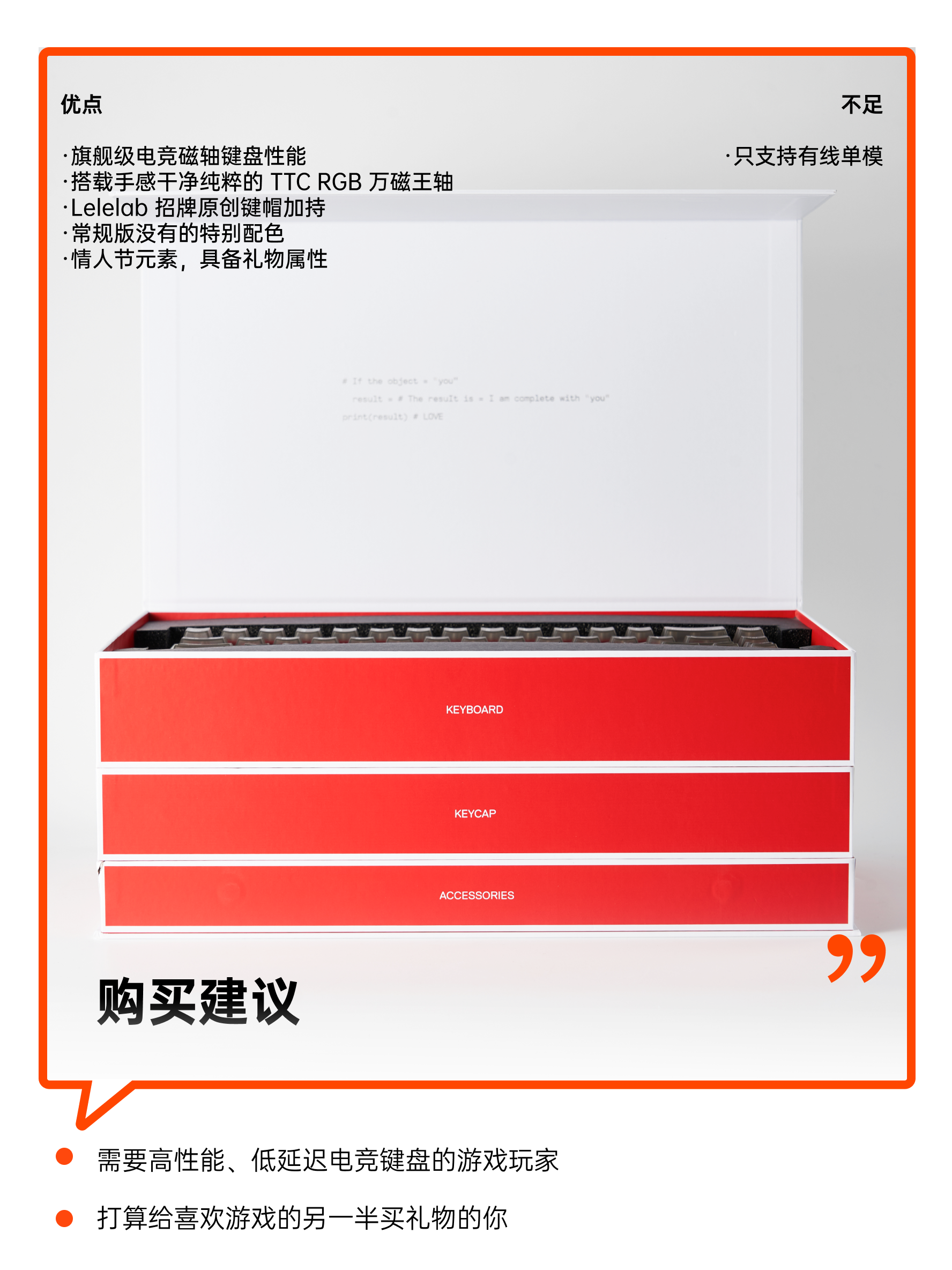 礼盒有黑光和红光两个版块,礼盒分红三层,配备 TTC RGB 万磁王轴的 MADE68 Ultra,二层是一套 Lelelab SupSup 白红透光 79 键帽套装,套装附带了 11 个增补键帽,其中有五个是情东谈主节专属定制。