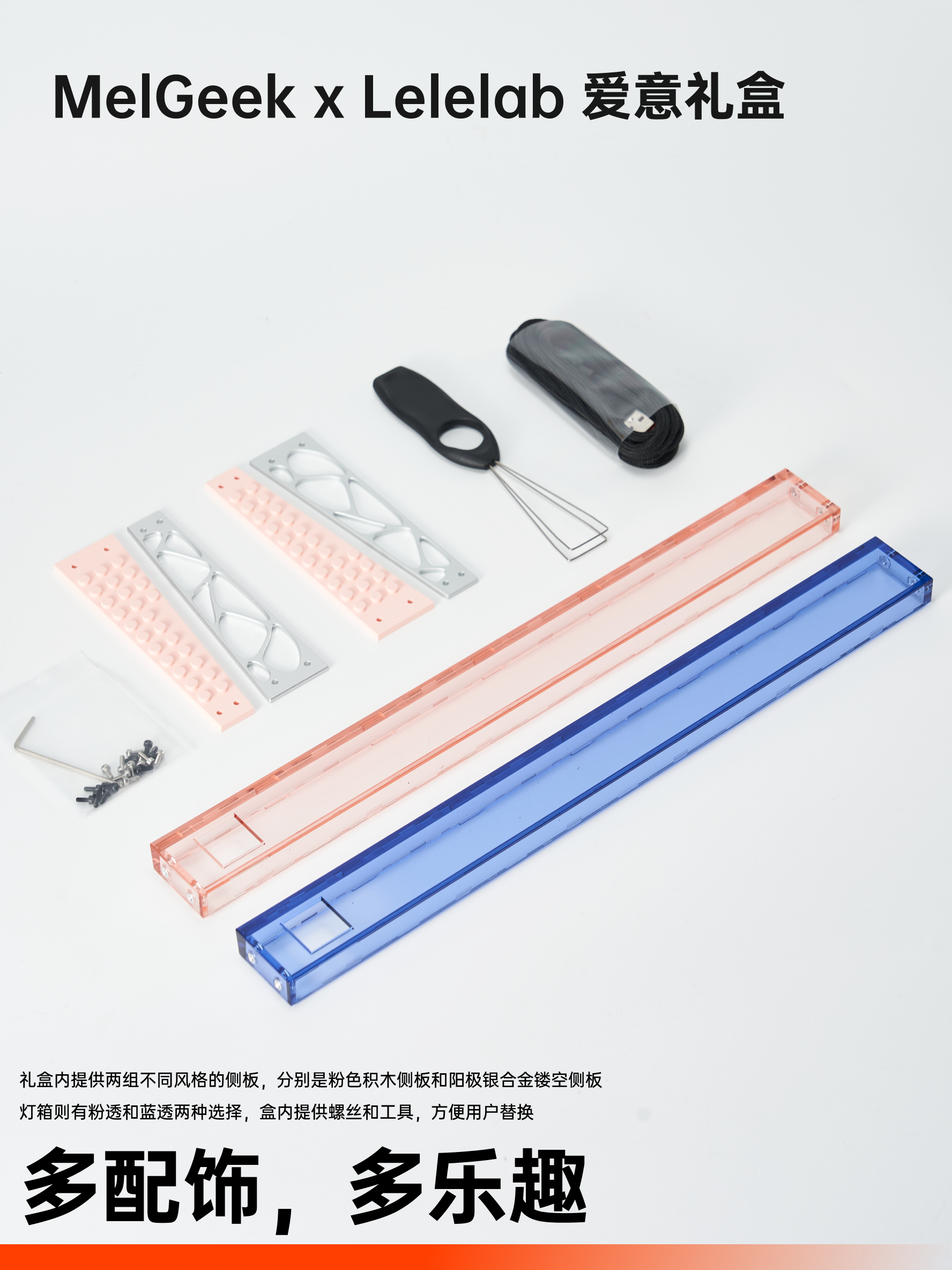 盒子的第三层则是黑、粉两种不齐心境的灯罩,还有积木和铝合金镂空两款可替换的侧板。另外 MelGeek 还会在套装内提供一条 USB-C to A 的数据线,以及一个替换键帽用的拔键器。